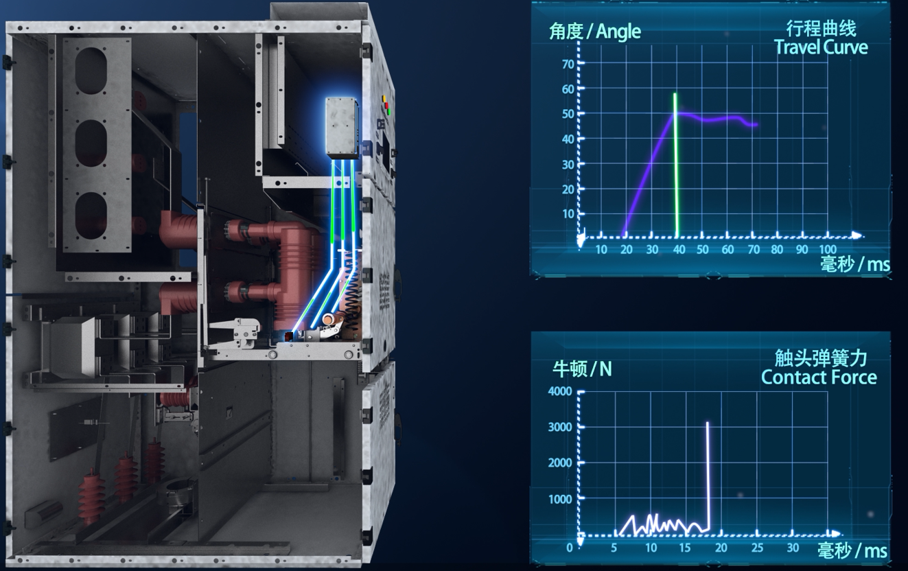 三相不同期監(jiān)測的方法主要是在斷路器三相安裝機(jī)械特性傳感器+接近開關(guān),采集分合閘過程的數(shù)據(jù),并由智能監(jiān)測裝置計(jì)算斷路器每次執(zhí)行分合閘動(dòng)作時(shí)斷路器三相的合分閘開距、超程、過沖、反彈、剛合/剛分速度、平均分合閘速度等。電氣智能化系統(tǒng)通過三相機(jī)械特性的指標(biāo)及曲線相對(duì)比,綜合計(jì)算斷路器每次操作過程中的狀態(tài),深度分析斷路器的健康狀態(tài),從而實(shí)現(xiàn)斷路器三相不同期監(jiān)測,并在出現(xiàn)劣化趨勢(shì)時(shí)及時(shí)告警。