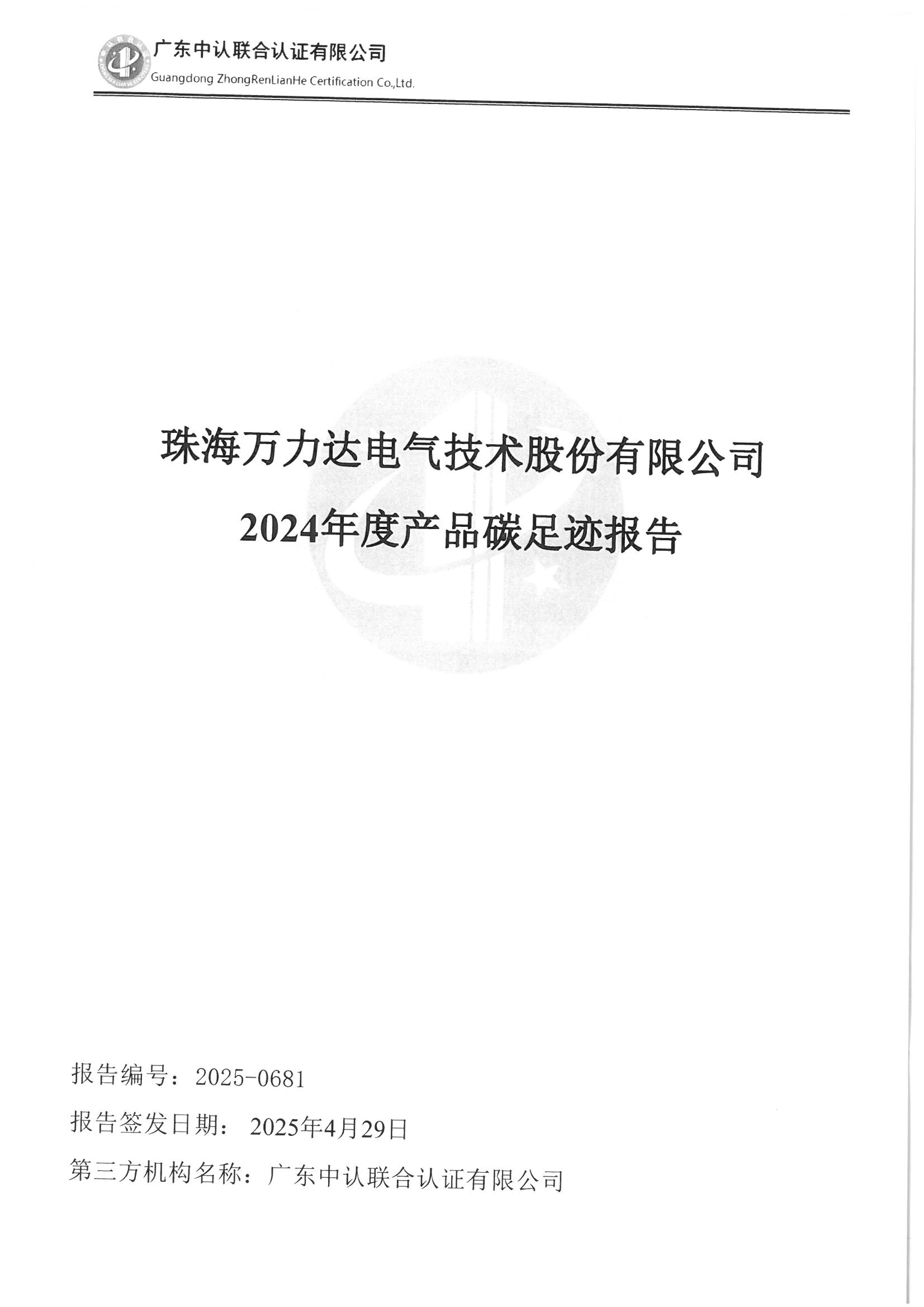 珠海萬力達電氣技術股份有限公司2024年度產(chǎn)品碳足跡報告公示